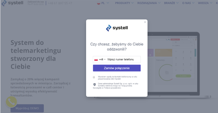 Po kliknięciu, użytkownikowi wyświetla się okienko zachęcające do pozostawienia numeru.