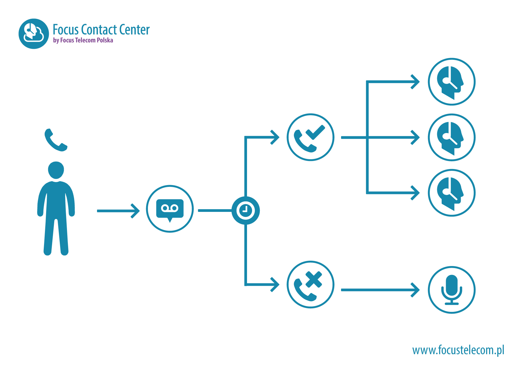 W tym czasie jego połączenie jest przekierowane do odpowiednich osób i albo jest od razu odebrane, albo oczekuje w kolejce, aż któraś z tych osób będzie mogła obsłużyć dane połączenie (zakończy poprzednią rozmowę lub inną czynność uniemożliwiającą natychmiastowe odebranie połączenia).