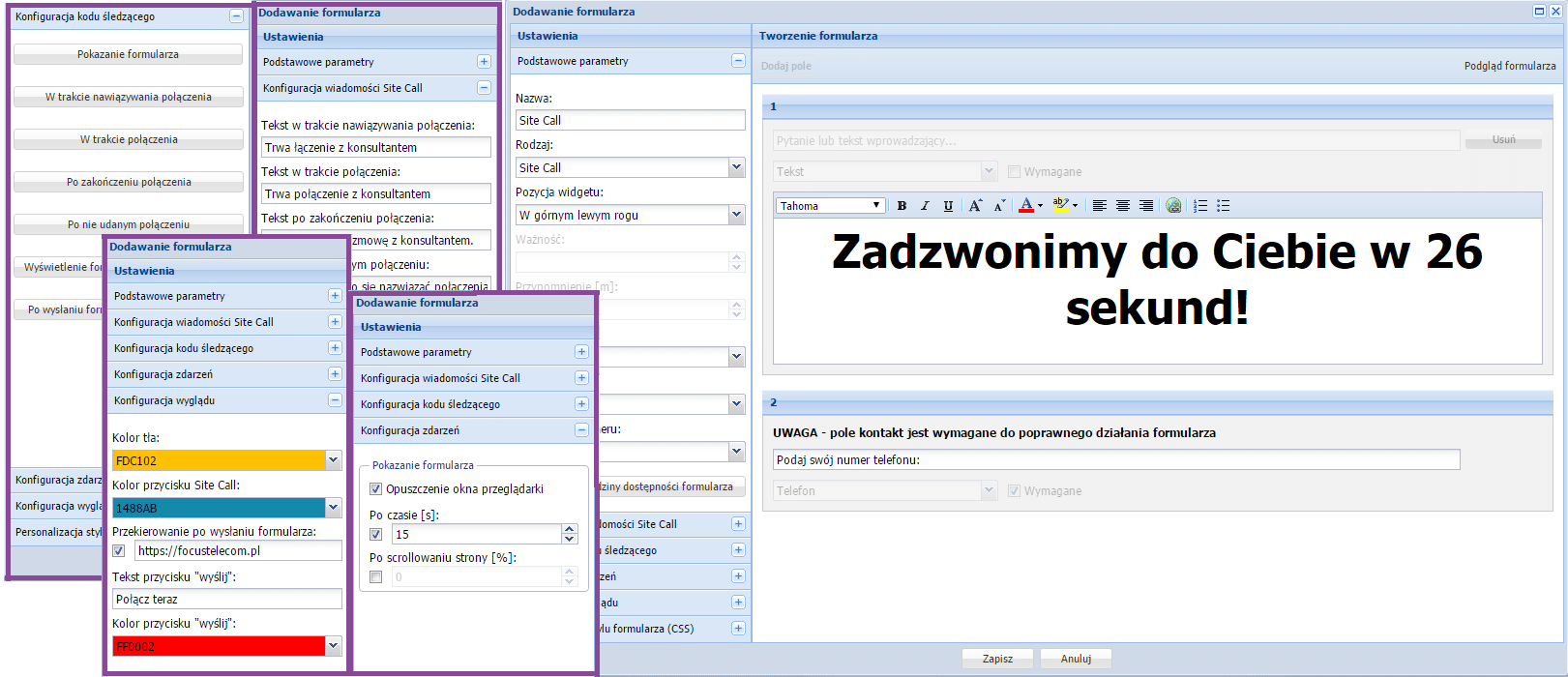 Masz pełną kontrolę nad swoim SiteCallem, decydujesz o kolorystyce, tekście, oraz kiedy się pojawi, na przykład gdy odwiedzający chce opuścić stronę (tzw. exit popup), po ustalonym przez Ciebie czasie, lub po przewinięciu w określone miejsce strony.